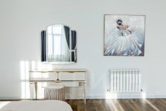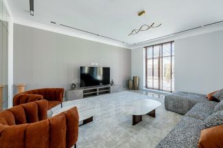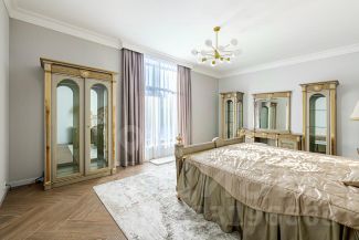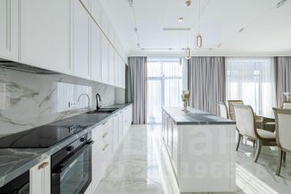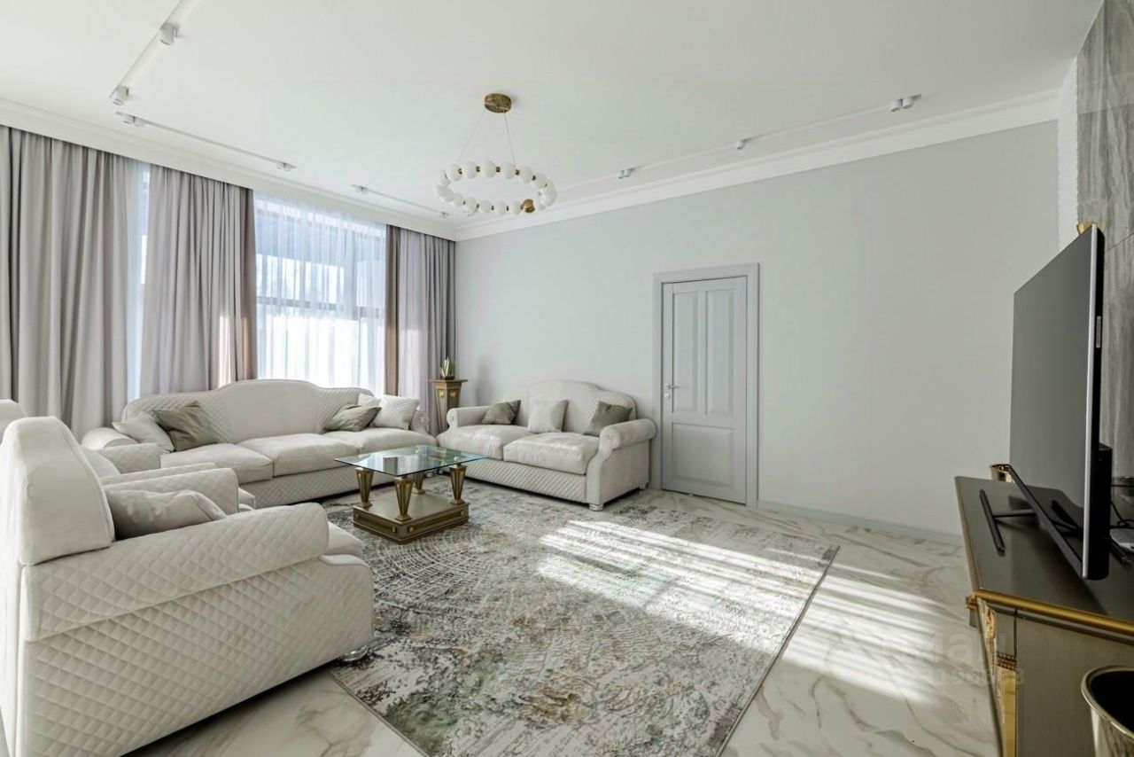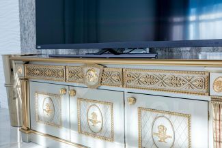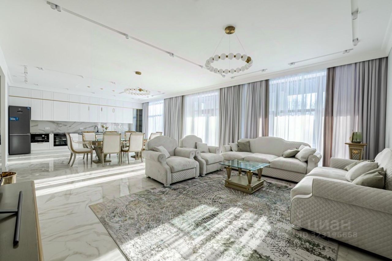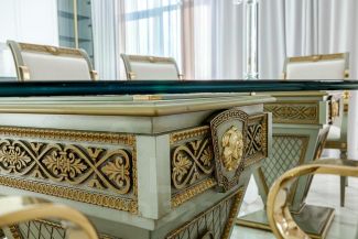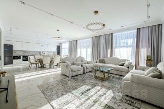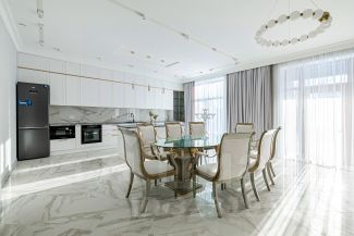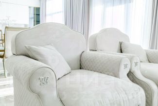 Интерьер выполнен в классическом стиле, светлые тона создают ощущение простора. Мебель и аксессуары подобраны со вкусом. Мягкая мебель и стол от Versace.