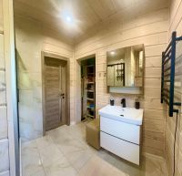 1 этаж: просторная кухня-столовая с встраиваемой техникой (холодильник, варочная панель, духовой шкаф, посудомоечная машина), гостиная, кладовая (стеллажи для хранения, второй большой холодильник), санузел с душевой кабиной, хоз комната (система водоочистки, стиральная машина, стеллажи для хранения), веранда.
