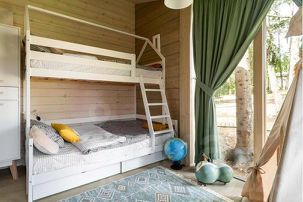 В спальне имеется двуспальная кровать 160*200, в гостевой комнате - диван-кровать 140*200, в гостиной зоне - диван 160*200, в детской комнате - двухъярусная кровать (первый ярус - 120*90, второй - 90*190)