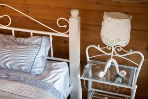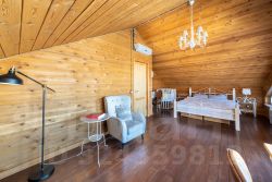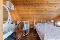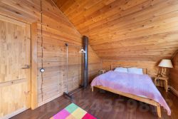 На втором этаже — уютная мансардная спальня, оформленная в светлых тонах и натуральном дереве. Большая кровать, удобные тумбочки, мягкий текстиль — всё располагает к полноценному отдыху.