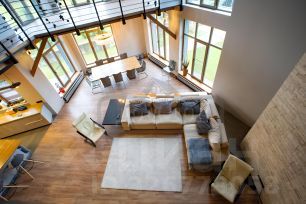 В ДОМЕ: 3 этажа, 450 кв.м., 5 спален, 10 комфортных спальных мест. Просторная терраса со скамейками. Холл с большим диваном. Гостиная 120 кв.м. на 50 персон с вторым светом и панорамными окнами, высота потолков 8 м. Обеденная зона с диваном и столом на 15 персон. Кухня-островок с необходимой посудой и техникой. Спальня. Сауна с подсветкой на 10 персон, обливное ведро. На втором этаже 3 спальни, терраса с диваном, холл с пространством для работы.