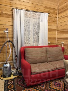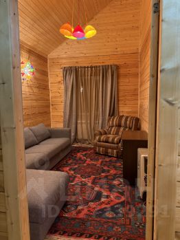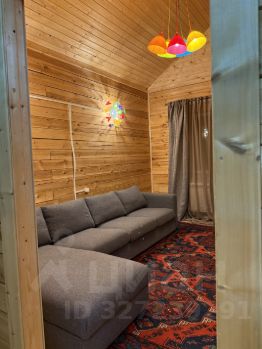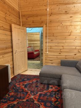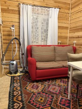 Уютный деревянный домик в лесу с двумя спальнями и большой кухней с гостевым диваном.