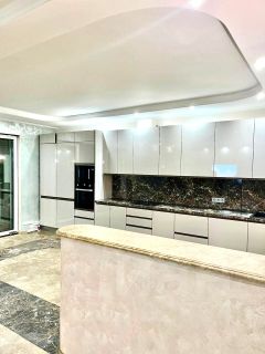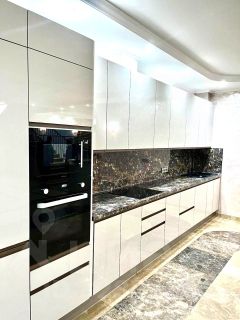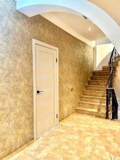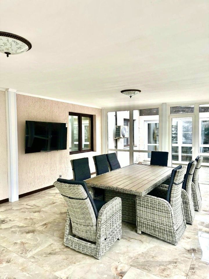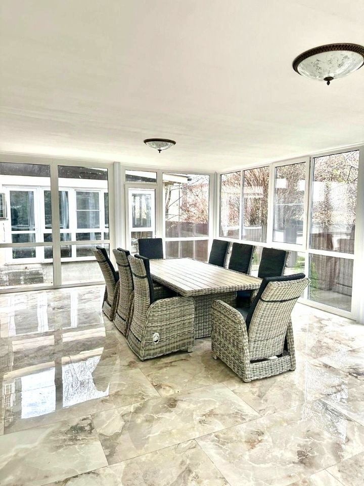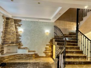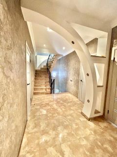 На первом этаже гостиная совмещена с кухней. Панорамное остекление террасы от пола до потолка, мраморные полы создают атмосферу простора и уюта. На участке зона барбекю. Также на этаже с\у с душевой кабиной, постирочная и гардеробная.