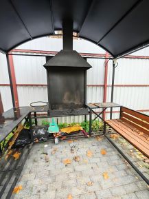 На улице мангальная зона, кресла и столик, шампуры, качели.