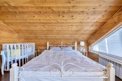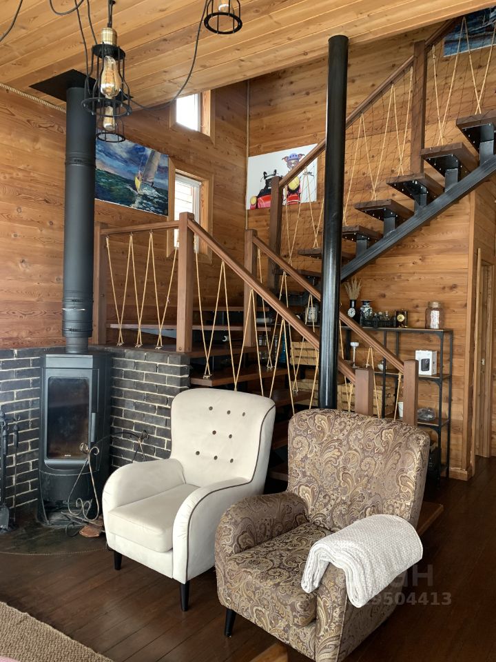 1 этаж — просторная кухня-гостиная с барной стойкой — экран для проектора — угловой раскладной диван у камина — спальня с широкой двухъярусной кроватью, где ощущаешь себя скорее как в уютной каюте
