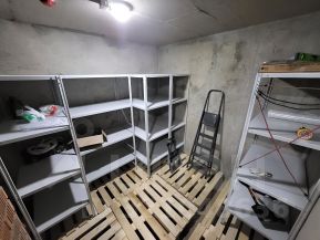 Кладовое помещение -1 этаж рядом с подьездом номер 5. На полу палеты, установлены стеллажи, металлическая дверь с вентиляцией. есть освещение (электричество). Доступ к камерам наблюдения. 9.2 кв.м.
