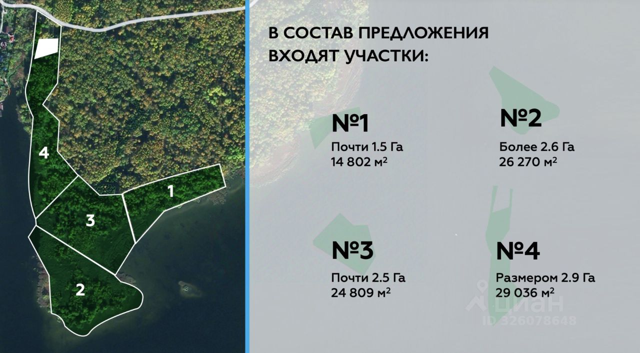 Участок 1: 1,5 га;Участок 2: 2,6 га;Участок 3: 2,5 га;Участок 4: 2,9 га.