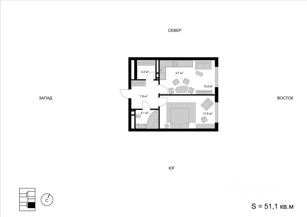 2-комн. квартира, 51,1 м²