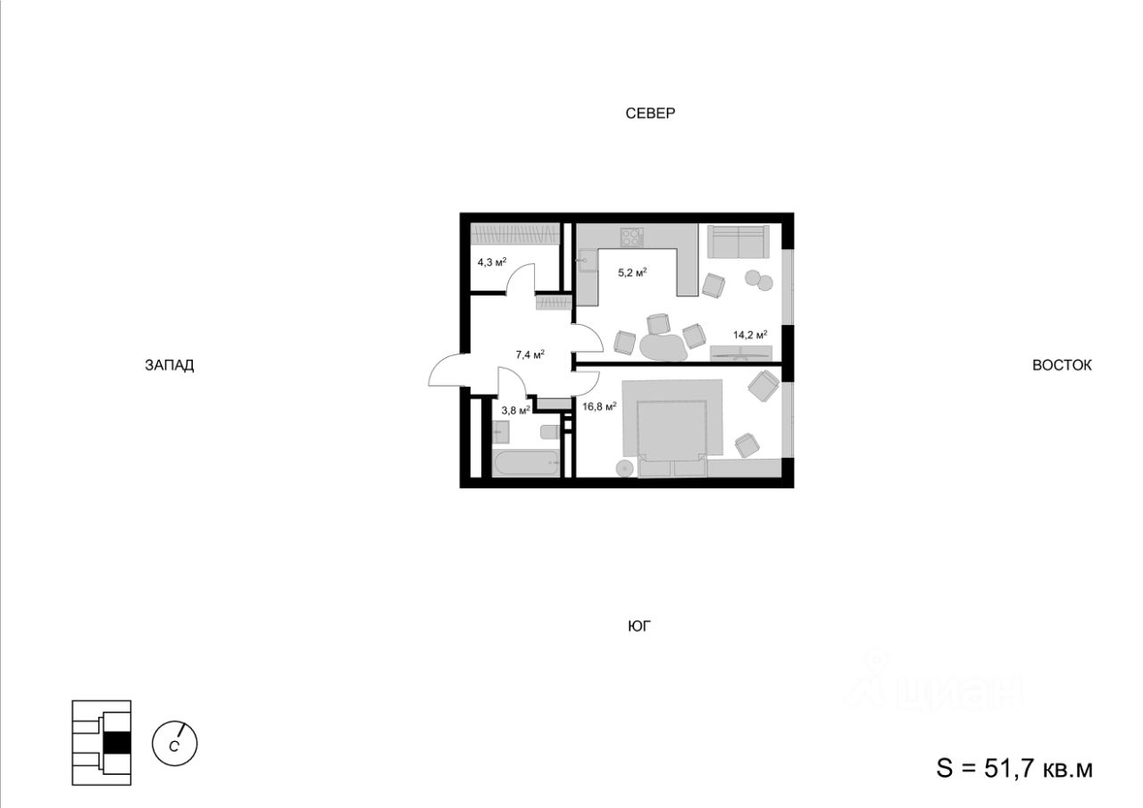2-комн. квартира, 51,7 м²