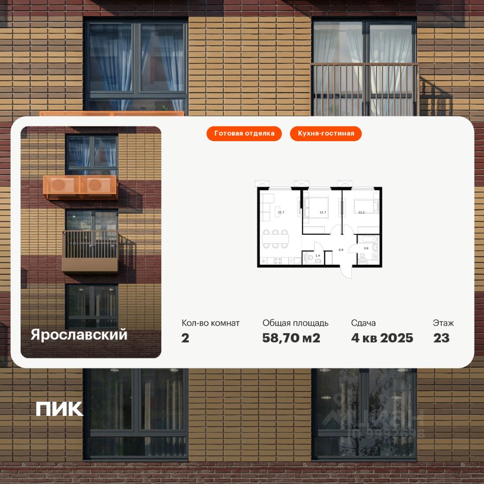 Продаётся 2-комн. квартира площадью 58,7 кв.м на 23 этаже 25 этажного дома (Корпус 16.1, Секция 1) проекта ПИК Ярославский. Светлый просторный подъезд на уровне земли, функциональная планировка, большие окна, c отделкой.