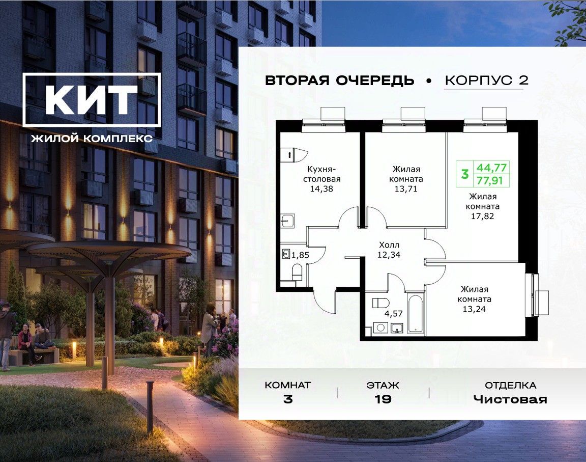 Продаётся 3-к квартира 77.91 кв.м. с чистовой отделкой в ЖК "КИТ2" на 19-м этаже 25 этажного дома.Жилой комплекс "Кит 2" спроектирован в урбанистической концепции "Город в Городе".