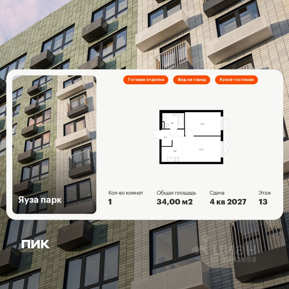 Продаётся 1-комн. квартира площадью 34 кв.м на 13 этаже 24 этажного дома (Корпус 7, Секция 1) проекта ПИК Яуза парк. Светлый просторный подъезд на уровне земли, функциональная планировка, большие окна, c отделкой.