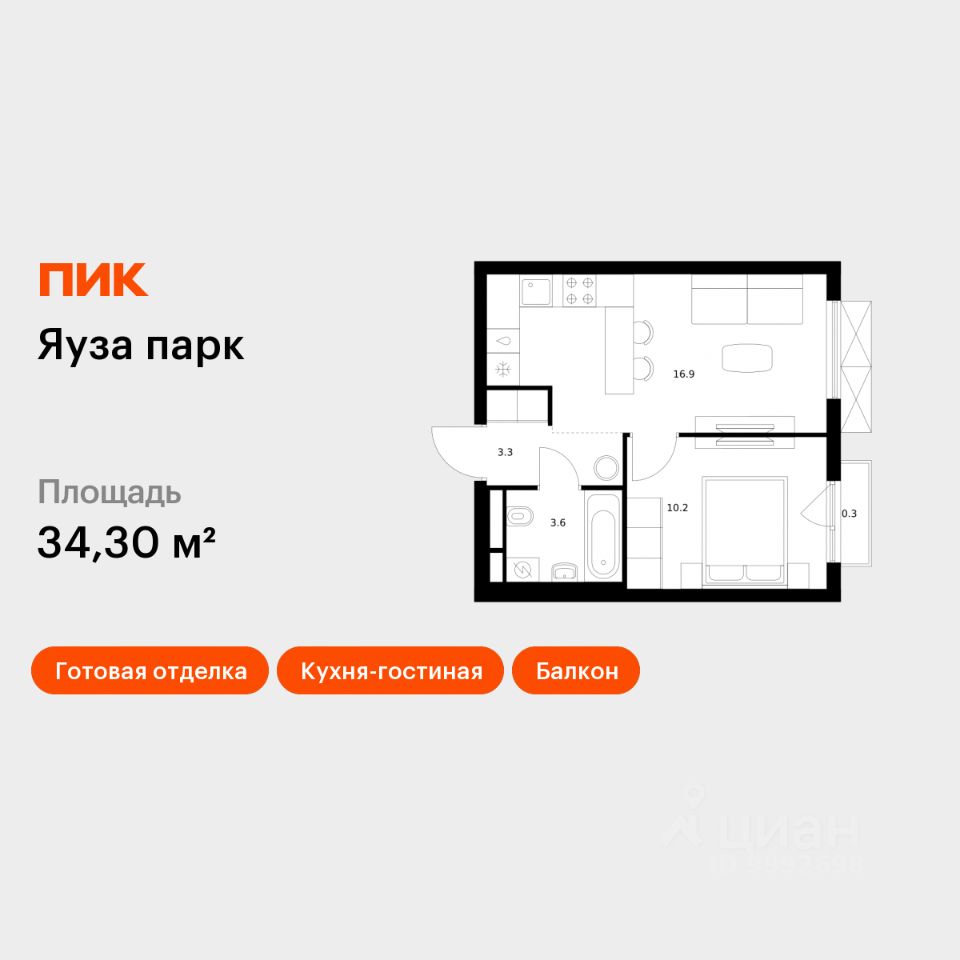 Продаётся 1-комн. квартира площадью 34,3 кв.м на 2 этаже 25 этажного дома (Корпус 9, Секция 1) проекта ПИК Яуза парк. Светлый просторный подъезд на уровне земли, функциональная планировка, большие окна, c отделкой.