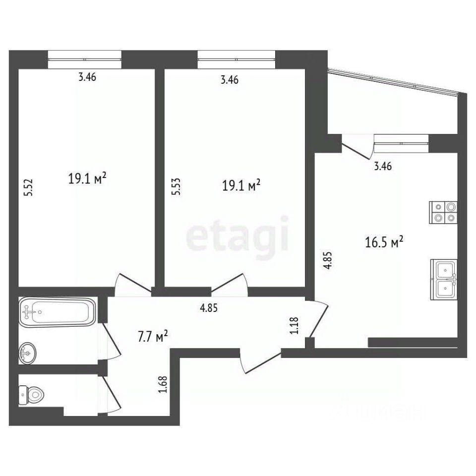 В квартире 2 изолированные комнаты. Площадь комнат -19.0 и 19.2 кв.м.