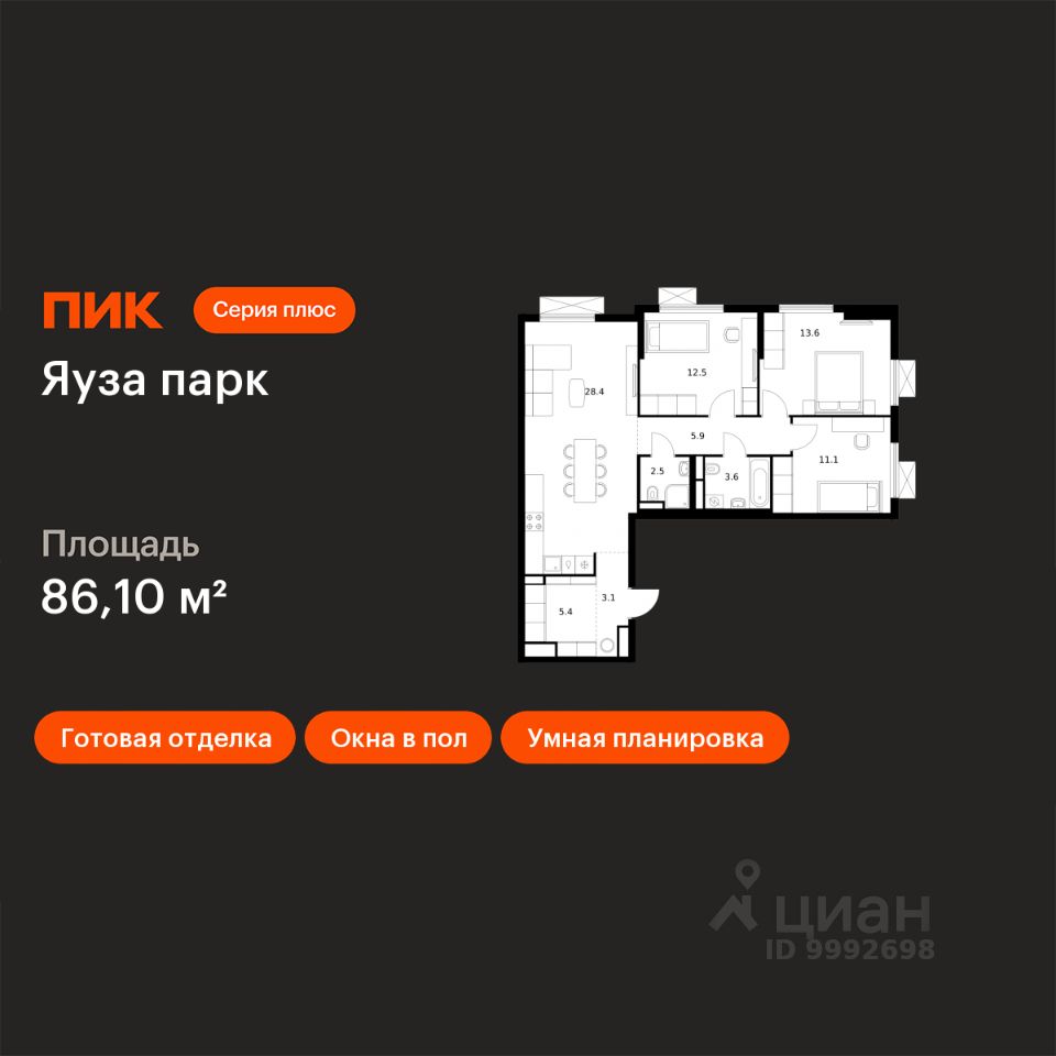 Продаётся 3-комн. квартира площадью 86,1 кв.м на 25 этаже 25 этажного дома (Корпус 9, Секция 1) проекта ПИК Яуза парк. Светлый просторный подъезд на уровне земли, функциональная планировка, большие окна, c отделкой.