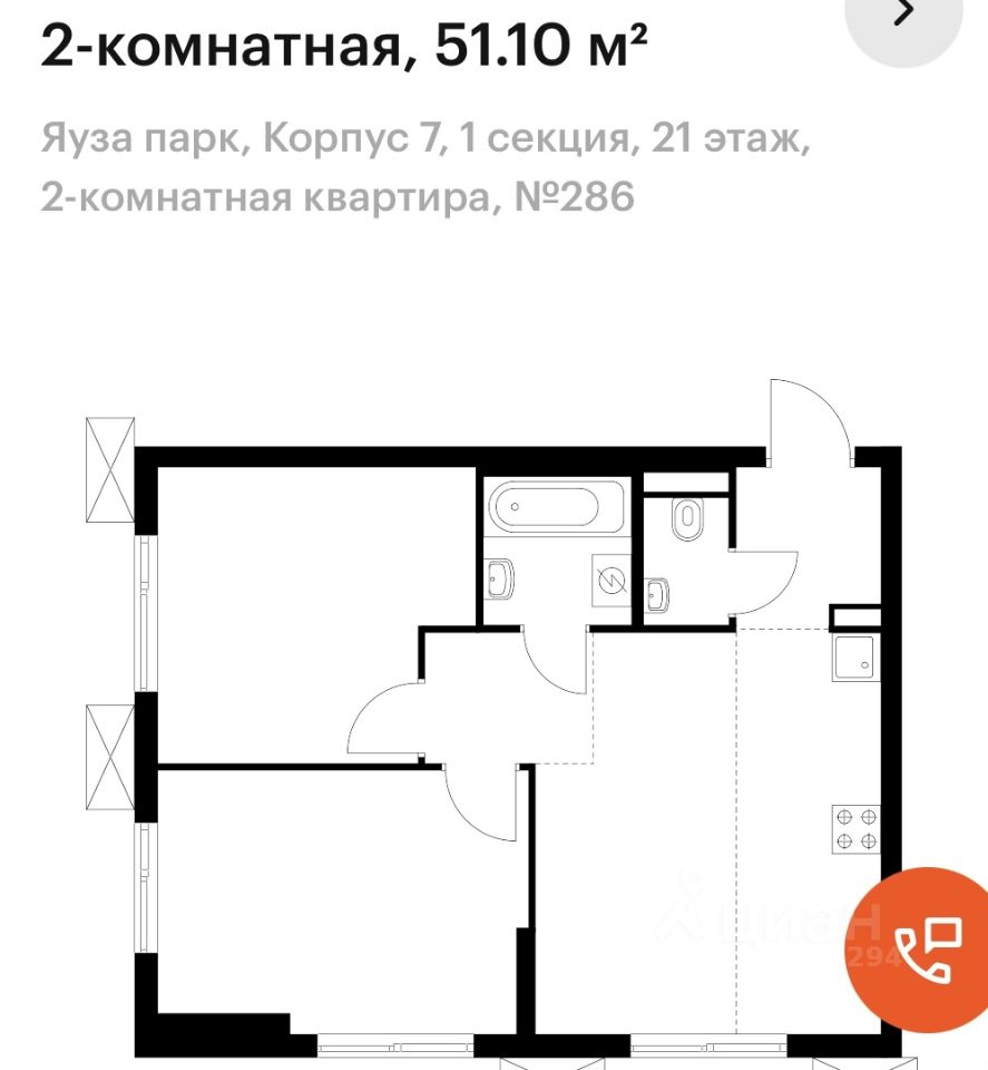 Продаётся 2-комн.квартира площадью 51.1 кв.м на 21 этаже 22 этажного дома (Корпус 7 секция 1) проекта ПИК Яуза парк.