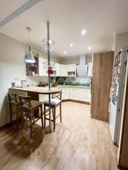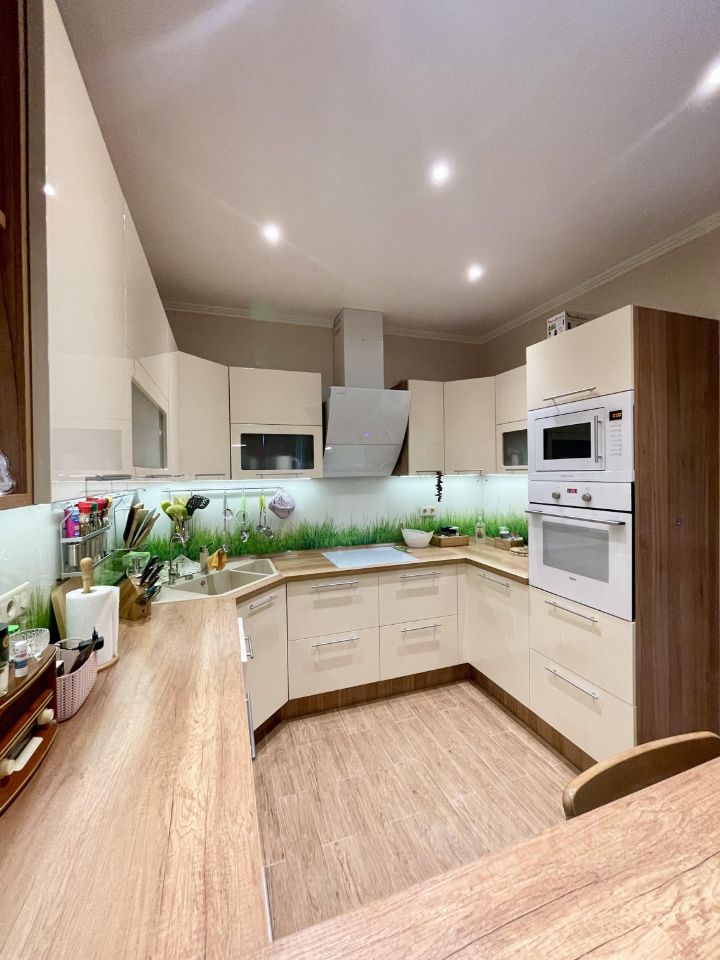 Кухня — настоящее сердце квартиры. Современный дизайн с глянцевыми фасадами, столешницей из материала под цвет дерева и стильной барной стойкой позволяет готовить с удовольствием. Встроенная техника, вместительные шкафы и даже декоративный зеленый луг на фартуке кухни делают это пространство не только функциональным, но и эстетически привлекательным.