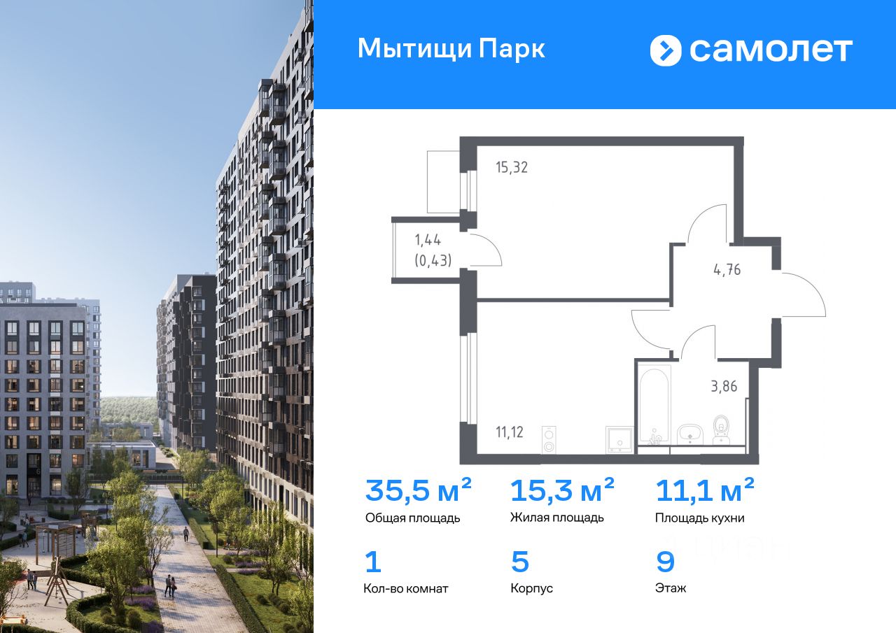 Предлагается 1-комнатная квартира комфорт-класса 35,49 кв.м в корпусе 5 на 9 этаже, в ЖК "Мытищи Парк"