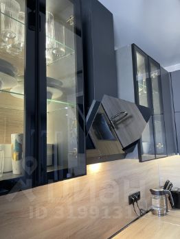 Сделана под заказ. Фурнитура Blum, везде установлены доводчики. Холодильник встроенный, с дополнительным пространством для хранения над ним. Стеклянные ящики для хранения посуды с вертикальной подсветкой. Вытяжка, индукционная плита, духовка, посудомойка. Под раковиной установлен фильтр, раковина и кран Omoikiri. Барная стойка.
