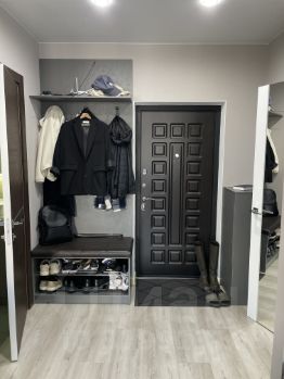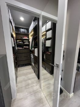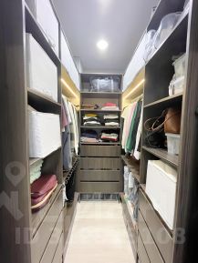 Отдельная гардеробная с продуманной системой хранения. 2 широкие брючницы, полки для хранения сезонной одежды и обуви. Подсветка основной зоны хранения на вешалках. Имеются нижи для хранения гладильной доски и швабры. Везде установлены доводчики. Дверь в гардеробную с зеркалом с двух сторон.