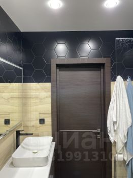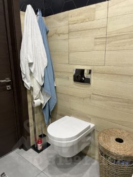 Совмещенный санузел. Туалет подвесной Villeroy&Boch. Большое зеркало с подсветкой, накладная раковина и кран. Стеклянная душевая перегородка. Встроенная стиральная машина, система хранения под столешницей. Скрытый люк - доступ к счетчикам, скрытый откидной люк - доступ под ванную.