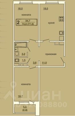 Общая площадь 74,8 кв.м (77,6 с лоджией). Из них комната 18 кв.м., комната 16,7 кв.м., кухня 18 кв.м., прихожая 11 кв.м., коридор 3,6 кв.м.