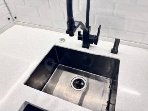 - Вся мебель — изготовлена на заказ под эту квартиру, фасады эмалированные, фурнитура с доводчиками.
