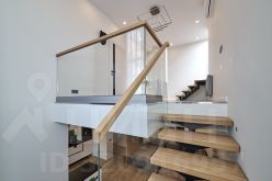 Лестница сделана под заказ, ступени из массива дуба, cтеклянное закалённое ограждение Optiwhite. На полу конвекторы, также установлена система увлажнения воздуха.