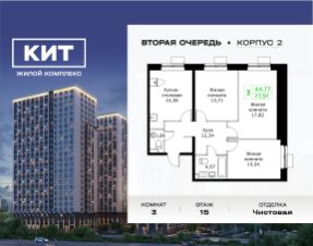 Продаётся 3-к квартира 77.91 кв.м. с чистовой отделкой в ЖК "КИТ2" на 15-м этаже 25 этажного дома.Жилой комплекс "Кит 2" спроектирован в урбанистической концепции "Город в Городе".