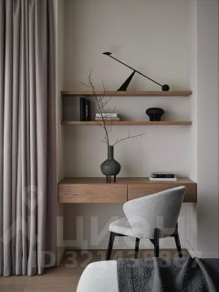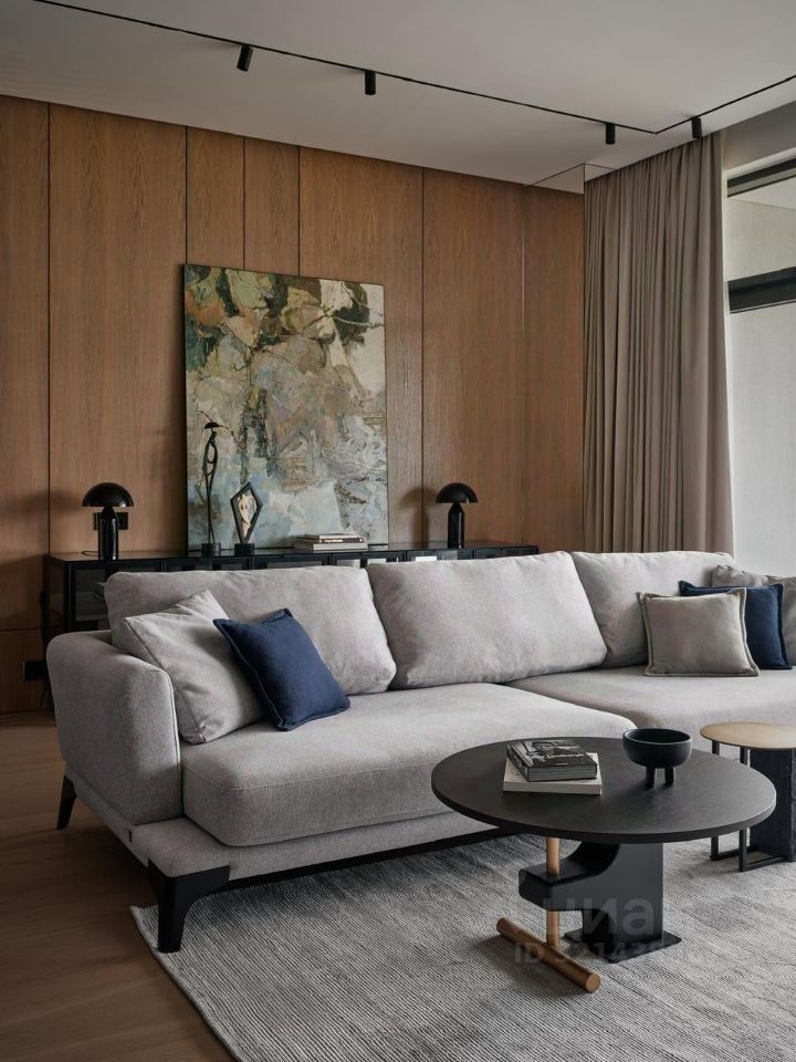 • Современный авторский проект с использованием премиальных материалов (натуральное дерево, камень, дизайнерская мебель).