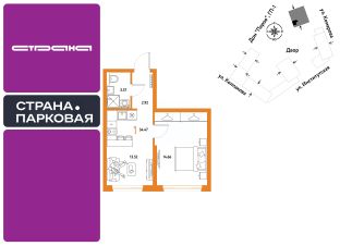 1комнатная квартира площадью 34,47кв. м. на 9 этаже от застройщика Страна Девелопмент.