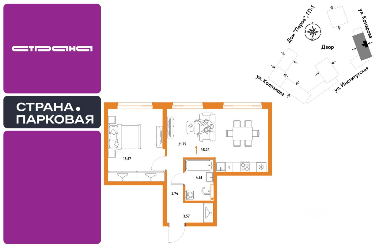 1комнатная квартира площадью 48,24кв. м. на 6 этаже от застройщика Страна Девелопмент.