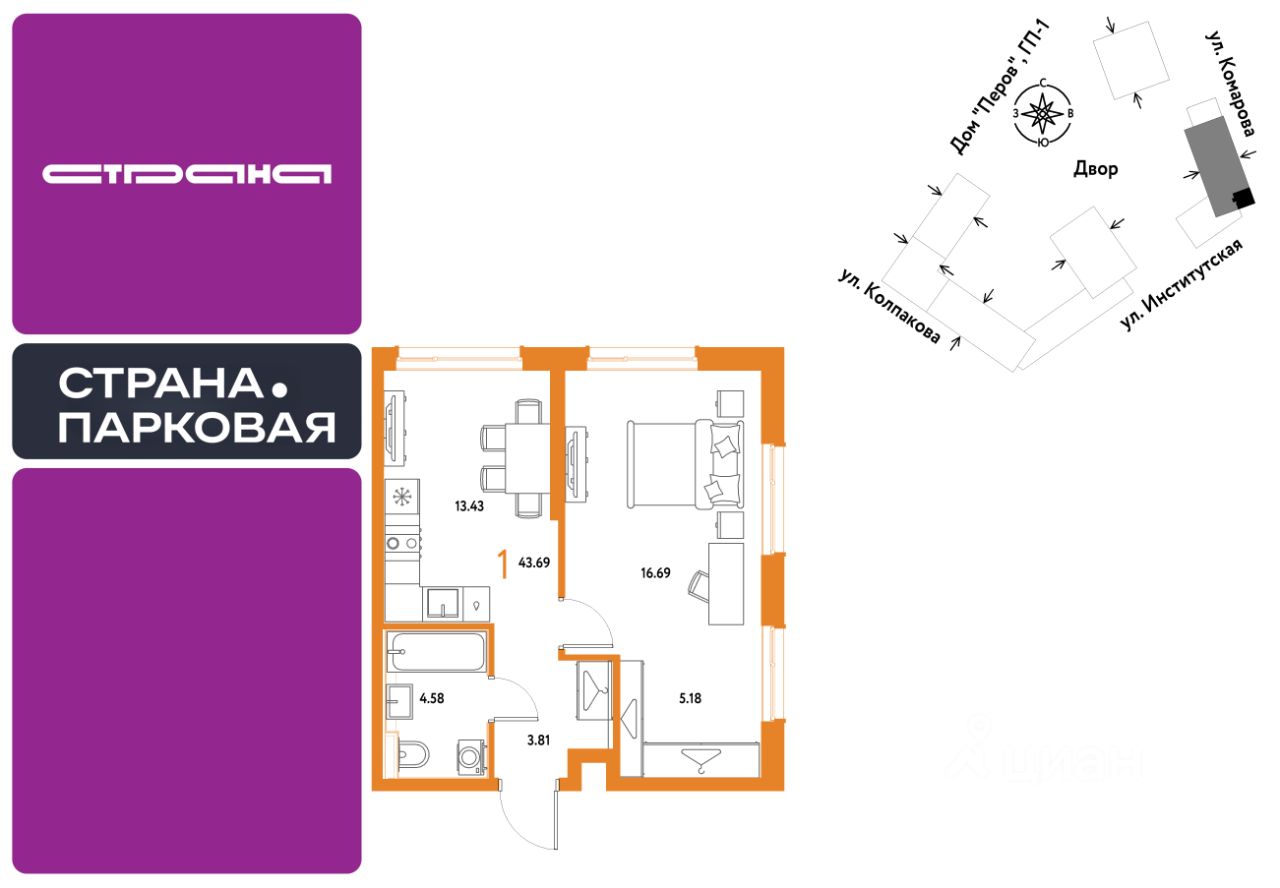 1комнатная квартира площадью 43,69кв. м. на 16 этаже от застройщика Страна Девелопмент.