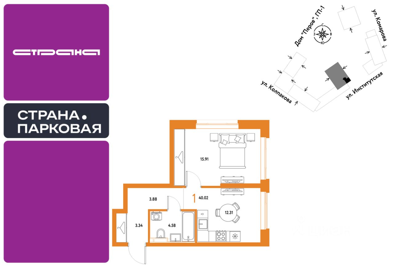1комнатная квартира площадью 40,02кв. м. на 10 этаже от застройщика Страна Девелопмент.