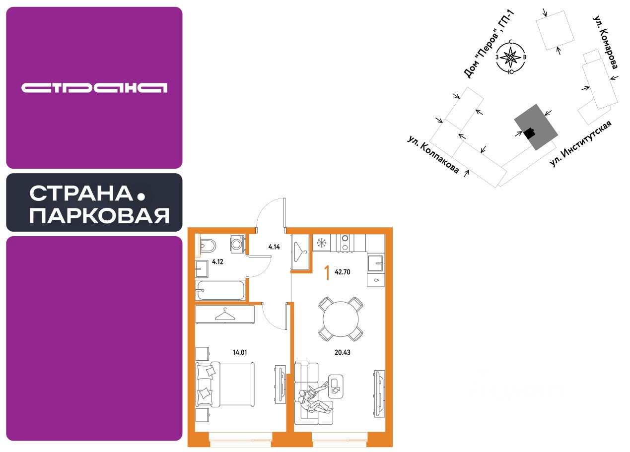 1комнатная квартира площадью 42,7кв. м. на 18 этаже от застройщика Страна Девелопмент.