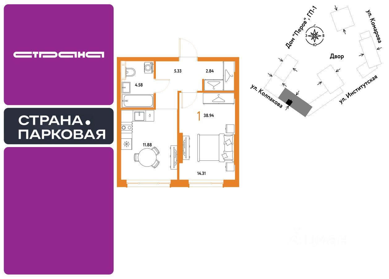 1комнатная квартира площадью 38,94кв. м. на 4 этаже от застройщика Страна Девелопмент.