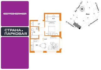 1комнатная квартира площадью 44,04кв. м. на 9 этаже от застройщика Страна Девелопмент.