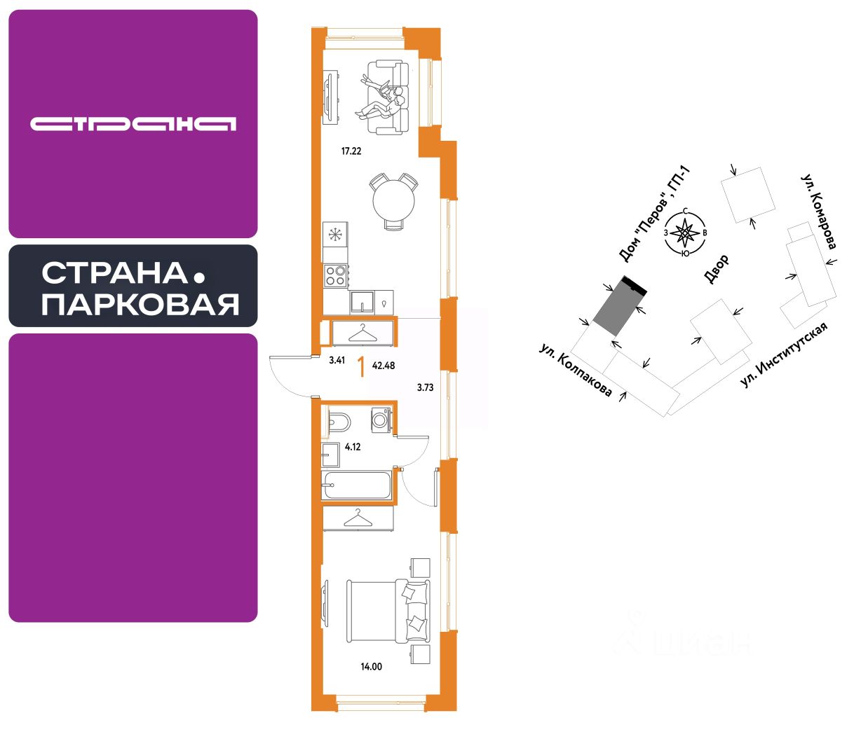 1комнатная квартира площадью 42,48кв. м. на 5 этаже от застройщика Страна Девелопмент.