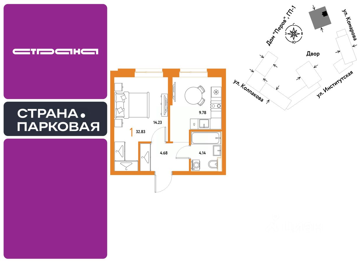 1комнатная квартира площадью 32,83кв. м. на 8 этаже от застройщика Страна Девелопмент.