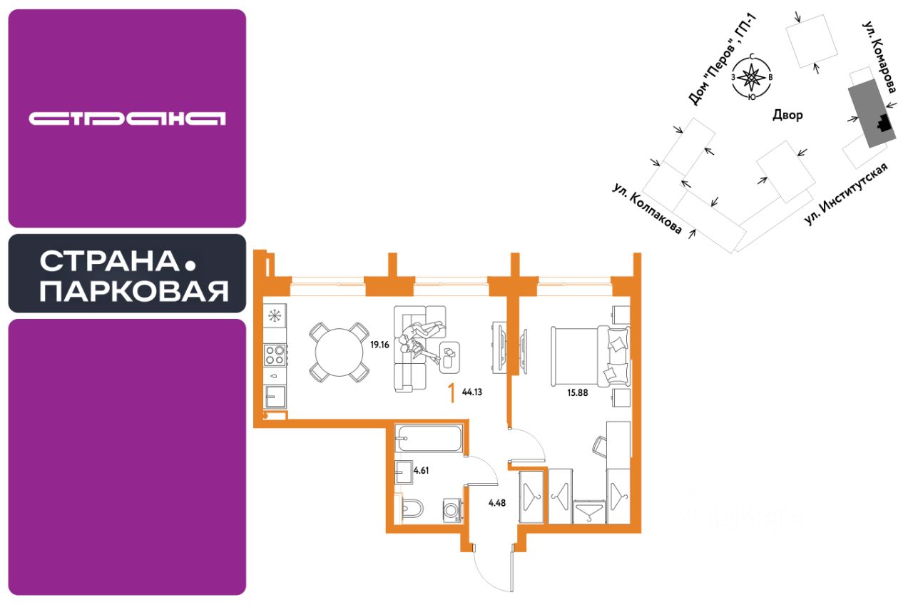 1комнатная квартира площадью 44,13кв. м. на 5 этаже от застройщика Страна Девелопмент.