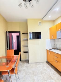 3 этаж. ПЛАНИРОВКА: Большая комната с эркером 17 кв.м. с раздвижным диваном, современной мебелью, кондиционером. Просторная обустроенная кухня 11,2 кв.м. (электрическая варочная панель, двухкамерный холодильник, микроволновая печь, вытяжка, плазменный телевизор). Большая лоджия с выходом из кухни. Санузел: хорошая сантехника, чугунная ванна Roca, стиральная машина Bosch. Отдельная оборудованная гардеробная. Дорогая, надежная входная дверь, на площадке тамбурная дверь.