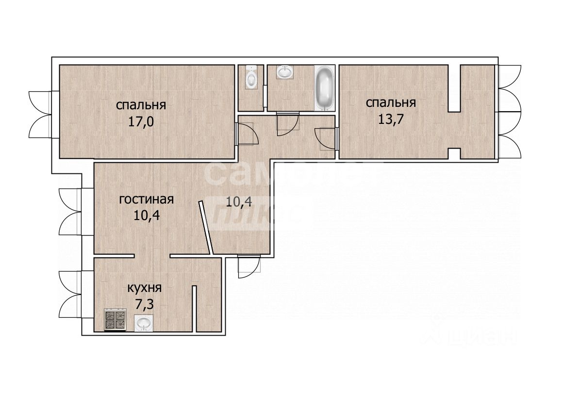 Общая площадь квартиры 64.6 кв.м. Просторная кухня- гостиная  площадью 17.7 кв.м. и комнаты площадью 17 и 13.7 кв.м. Сан.узел совмещенный с большой ванной, отделан плиткой. В прихожей стоит большой шкаф для верхней одежды и обуви.  Удобно, что грязная зона прихожей  находится отдельно и не пересекается с основными маршрутами по квартире.