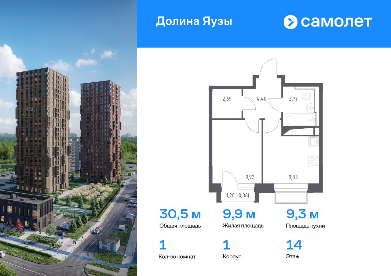 Строим кварталы для жизни с заботой о будущем. Предлагается 1-комнатная квартира комфорт-класса 30,47 кв.м в корпусе 1 на 14 этаже, в ЖК "Долина Яузы"