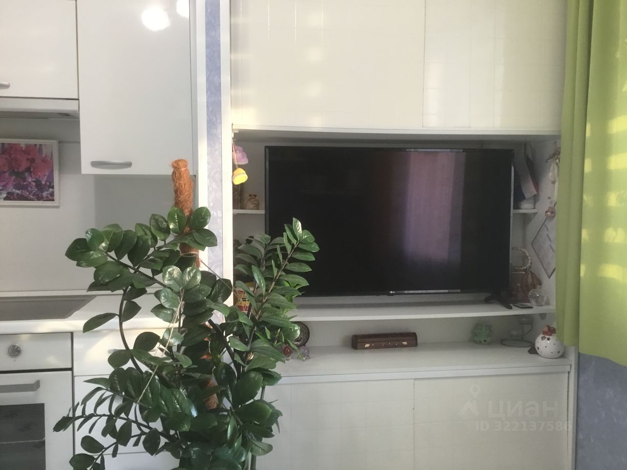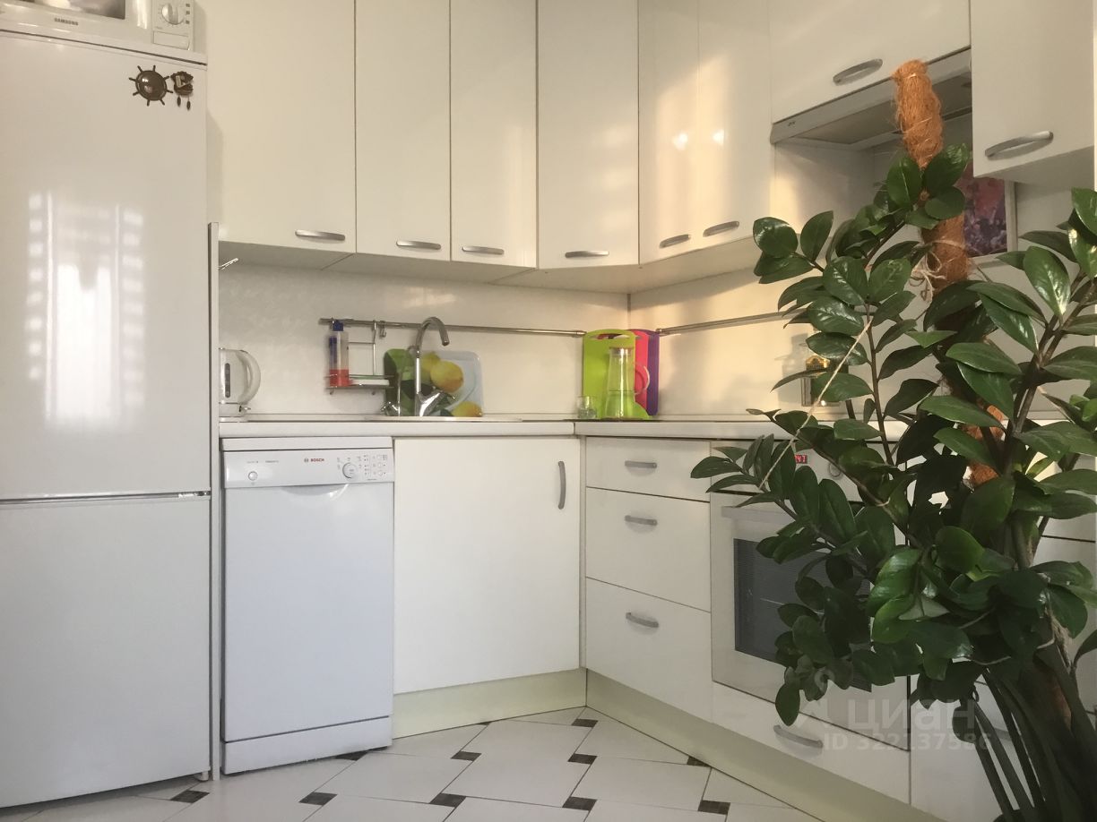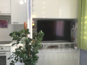 Основу кухонного гарнитура составляют встроенные шкафы со светлым фасадом, за которым легко ухаживать. Встроенная бытовая техника: холодильник, посудомоечная машина, варочная панель, духовой шкаф, вытяжка - практически незаметны и сливаются с общим фоном, создавая ощущение простора. Есть раскладной диван. Модель выбрана с учетом компактности и функционала: в раскладном виде он образует полноценную кровать, а в сложенном - удобное место для отдыха. Напротив дивана размещен большой телевизор с современной звуковой системой.