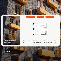 Продаётся 1-комн. квартира площадью 36,6 кв.м на 4 этаже 25 этажного дома (Корпус 2.2, Секция 1) проекта ПИК Ярославский квартал. Светлый просторный подъезд на уровне земли, функциональная планировка, большие окна, c отделкой.