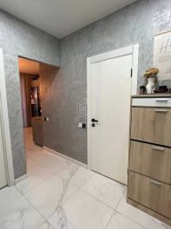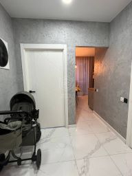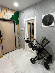 Pемонт cоздавался на coвесть и с душой: Пол: ламинат в комнате и гардеробной 33 класса. Керамогранит с системой теплый пол в кухне,с/у и коридоре. Стены: обои под покраску в комнате, декоративная штукатурка в кухне/коридоре, керамогранит в с/у. Потолки: натяжные с точечным освещением.