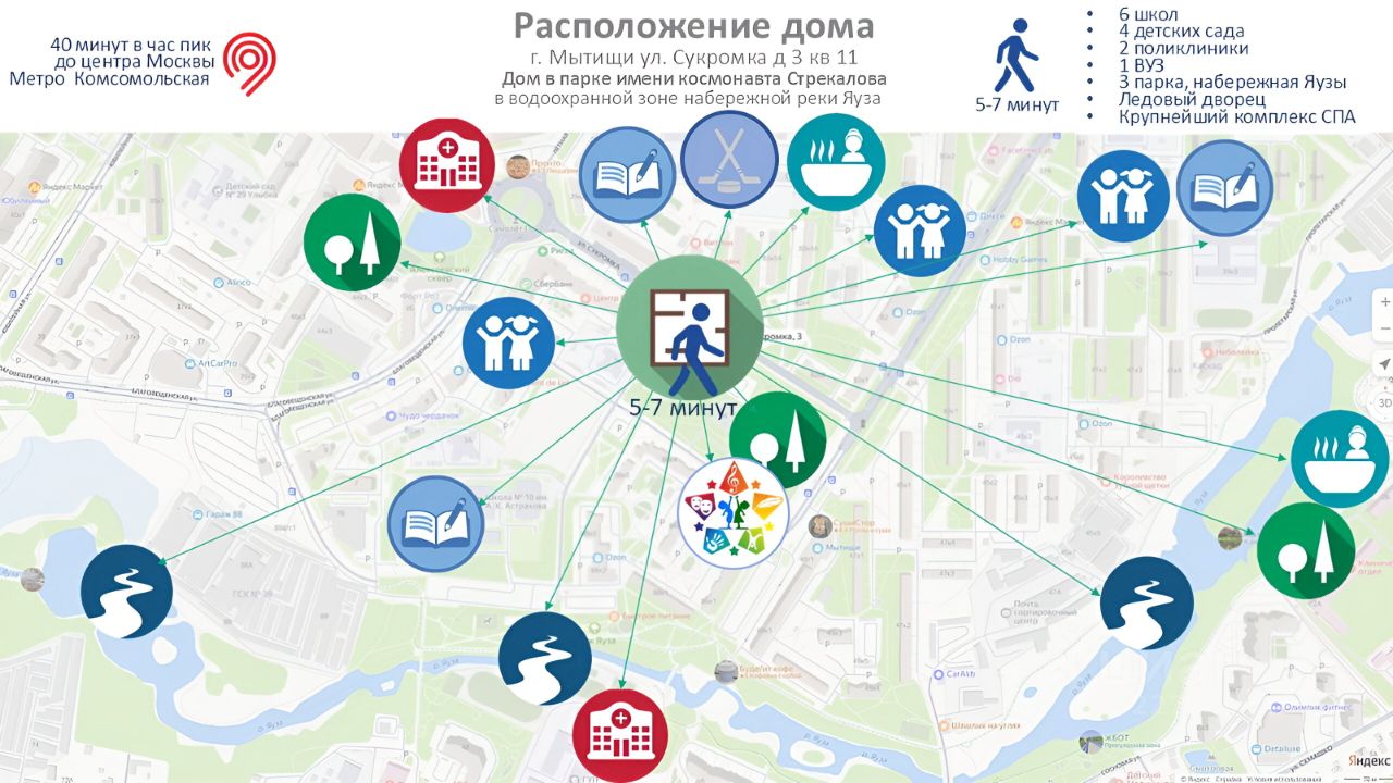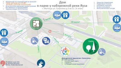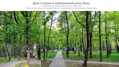 Подчеркнем дом находится в самом парке с доступностью к благоустроенной набережной реки Яуза со своими прогулочными комплексами.