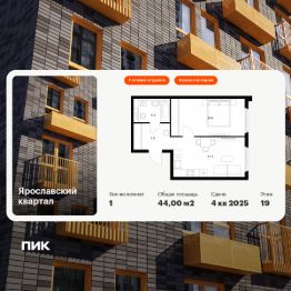 Продаётся 1-комн. квартира площадью 44 кв.м на 19 этаже 25 этажного дома (Корпус 1.4, Секция 1) проекта ПИК Ярославский квартал. Светлый просторный подъезд на уровне земли, функциональная планировка, большие окна, c отделкой.