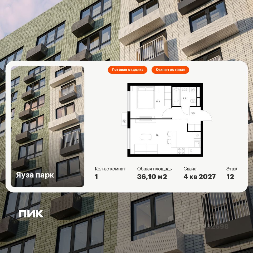 Продаётся 1-комн. квартира площадью 36,1 кв.м на 12 этаже 25 этажного дома (Корпус 11, Секция 1) проекта ПИК Яуза парк. Светлый просторный подъезд на уровне земли, функциональная планировка, большие окна, c отделкой.
