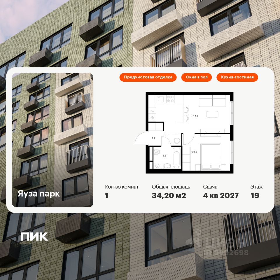 Продаётся 1-комн. квартира площадью 34,2 кв.м на 19 этаже 24 этажного дома (Корпус 12, Секция 1) проекта ПИК Яуза парк. Светлый просторный подъезд на уровне земли, функциональная планировка, большие окна, предчистовая отделка.